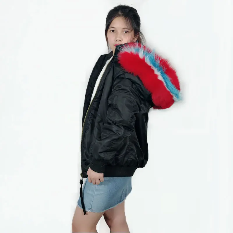 Wonderfull - Winter New Black Bomber Jacket with white artificial fur inside removable hooded raccoon fur collar Bombers